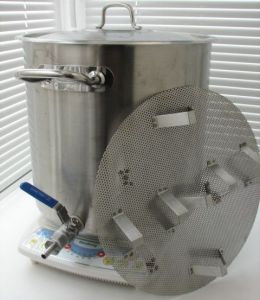 Обзавелся, наконец, сусловарочным баком из нержавейки. Теперь горячий экстракт остывает в окружении стали. Туда не проникает УФ излучение и всякая всячина из пищевого пластика. Может быть, еще чиллер покрыть хромом? Но не советуют.