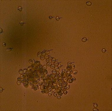 На второй день главного брожения была взята проба пива на предмет изучения под микроскопом. Сосчитать концентрацию клеток было довольно сложно, так как порой в поле зрения попадали довольно объемные комки, состоящие примерно из 100-200 дрожжевых клеток. Считать клетки в таких скоплениях весьма затруднительно. Концентрация клеток без учета больших скоплений составила 65 млн. клеток на мл пива, с учетом скоплений примерно 100 млн. клеток. Эти цифры свидетельствуют о нормальной ходе главного брожения.