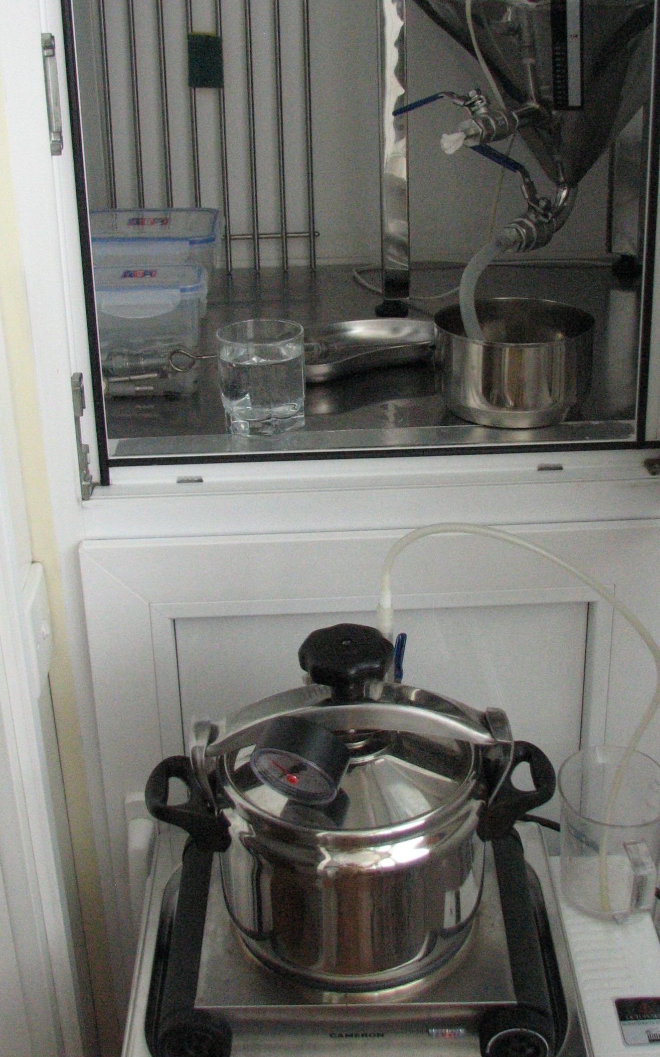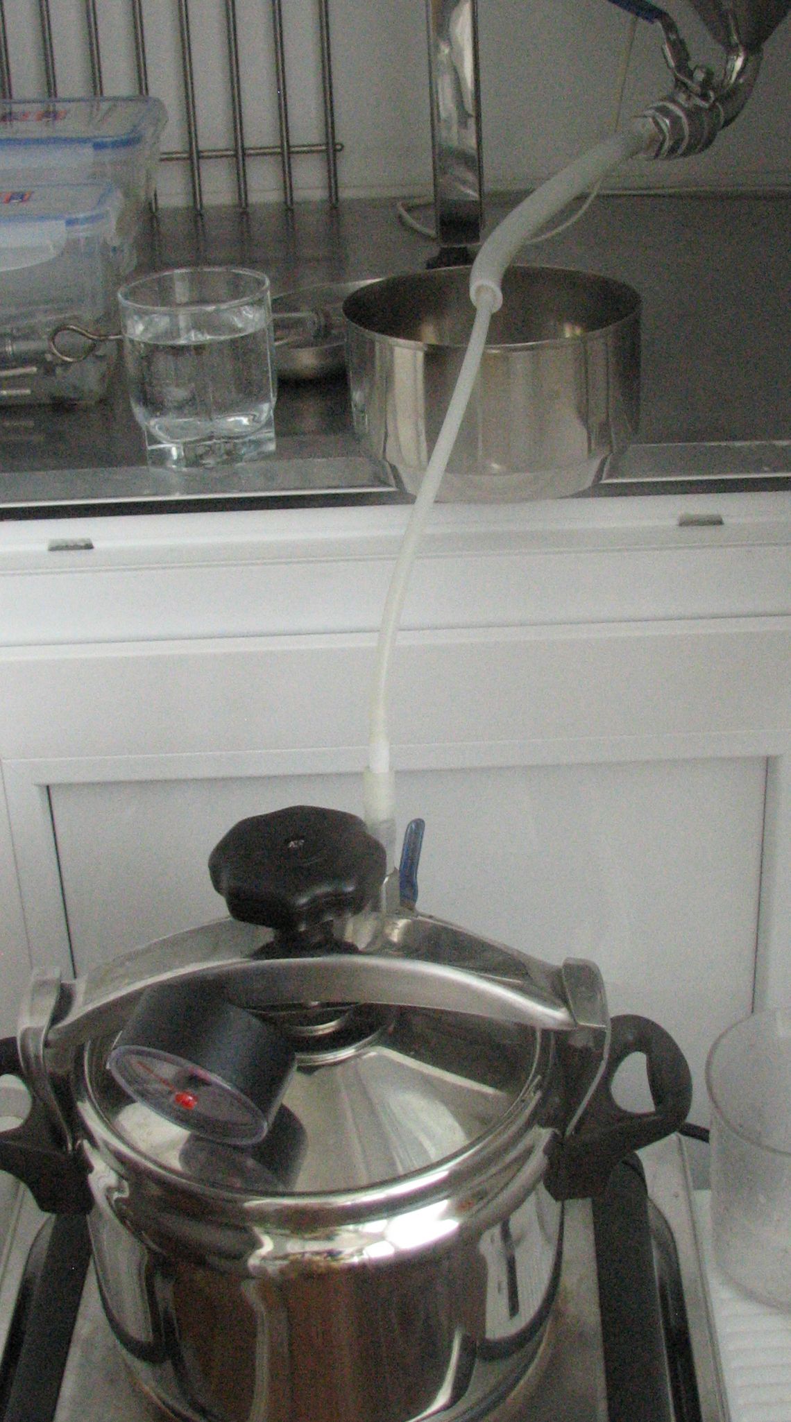 Рисунок 3. Вот так выглядит оборудование перед сливом дрожжей из нижнего крана ферментера. На штуцер крана надет силиконовый шланг большого диаметра. Свободный его конец опущен в контейнер из нержавеющей стали. Внизу можно видеть источник пара – скороварку. Верхний кран ферментера после обработки был закрыт стерильной салфеткой смоченной спиртом.
