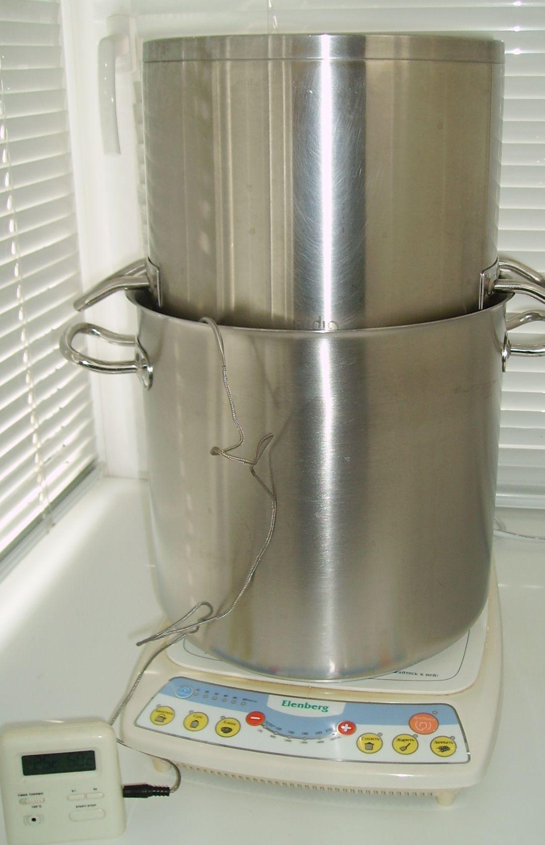 Как считает Rajotte, стерильное сусло для стартера это просто хорошо прокипяченное сусло (более получаса). Как известно при атмосферном давлении температура кипящего сусла чуть больше 100 градусов Цельсия. По мнению автора, этого вполне достаточно чтобы убить все вегетативные формы жизни, споры диких дрожжей и некоторые другие виды спор. Только особые формы теплоустойчивых спор переносят длительное кипячение. Технология подготовки такого сусла и посуды для разведения приведена ниже в картинках. Обычно сусло готовиться впрок. (У меня это чаше всего остаток в сусловарочном баке после варки пива, и я использую повторное кипячение сусла после хранения).