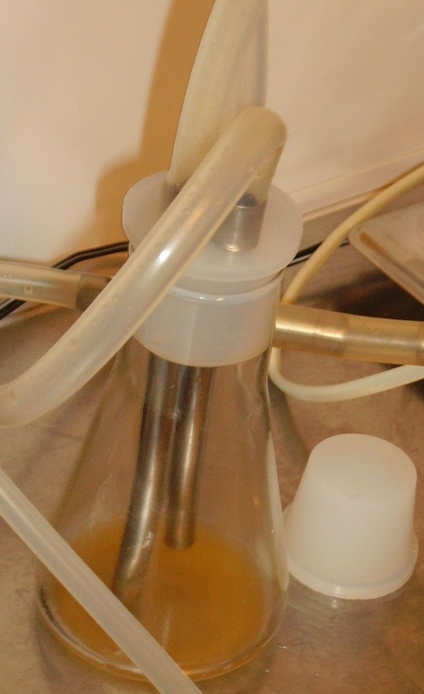 Ныне я не гонюсь за высокой стартовой концентрацией клеток в реторте на мешалке — это не требуется. Иногда я засеиваю в реторту 5 мл культуры прямо из пробирки (как в описанных экспериментах), иногда 50 — разницы особой нет. Однако стоит заметить, что я использую стерильное сусло и угроза контаминации исчезающе мала. Хотя это уже из другой области и требует отдельного разговора.