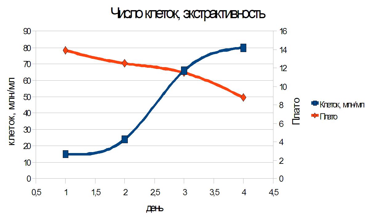 Первый и главный момент — до видимого экстракта 6-7%. Как будет показано ниже, это предел после которого дрожжи начнут переходить в стадию замедленного роста. Второй момент — 100-120 млн клеток/мл. Выше я уже отмечал, что 250 — 350 млн клеток на миллилитр сусла на магнитной мешалке можно получить лишь в отдельных специальных случаях. (С лагерными дрожжами история такая, что больше 120 млн/мл жизнеспособных клеток получать при указанных температурах размножения не всегда удается даже при активном перемешивании).