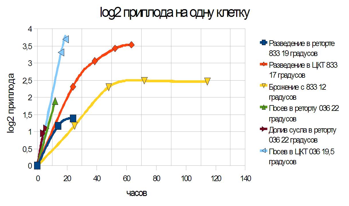 Выше я специально опустил рекомендованные автором (на основе рисунка 4) временные интервалы. Это было сделано потому, что приведенный в статье график — просто некая типичная кривая. Как будет показано ниже на практике реальные кривые роста могут иметь различный наклон к оси времени, что может оказаться весьма существенным фактором для разведения. (Между прочим, в подписи к рисунку этот факт отражен, только применительно лишь ко времени достижения стационарной фазе).