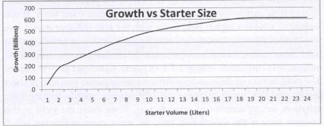 Вопрос первый: «какой величины стартер, Вы должны сделать, чтобы попасть в норму засева»? По мнению автора статьи, ответ можно легко получить используя рисунок 3. Однако необходимо принимать во внимание те оговорки, которые были сделаны выше. Самый оптимальный по объему сусла стартер дает использование магнитной мешалки. Считается, что в хорошо аэрируемом сусле дрожжи без каких-либо механических побуждений в виде перемешивания способны быстро вырасти до объема около 100 млн/мл (при отсутствии аэрации, концентрация оказывается раза в два три меньше, о причинах будет сказано ниже).