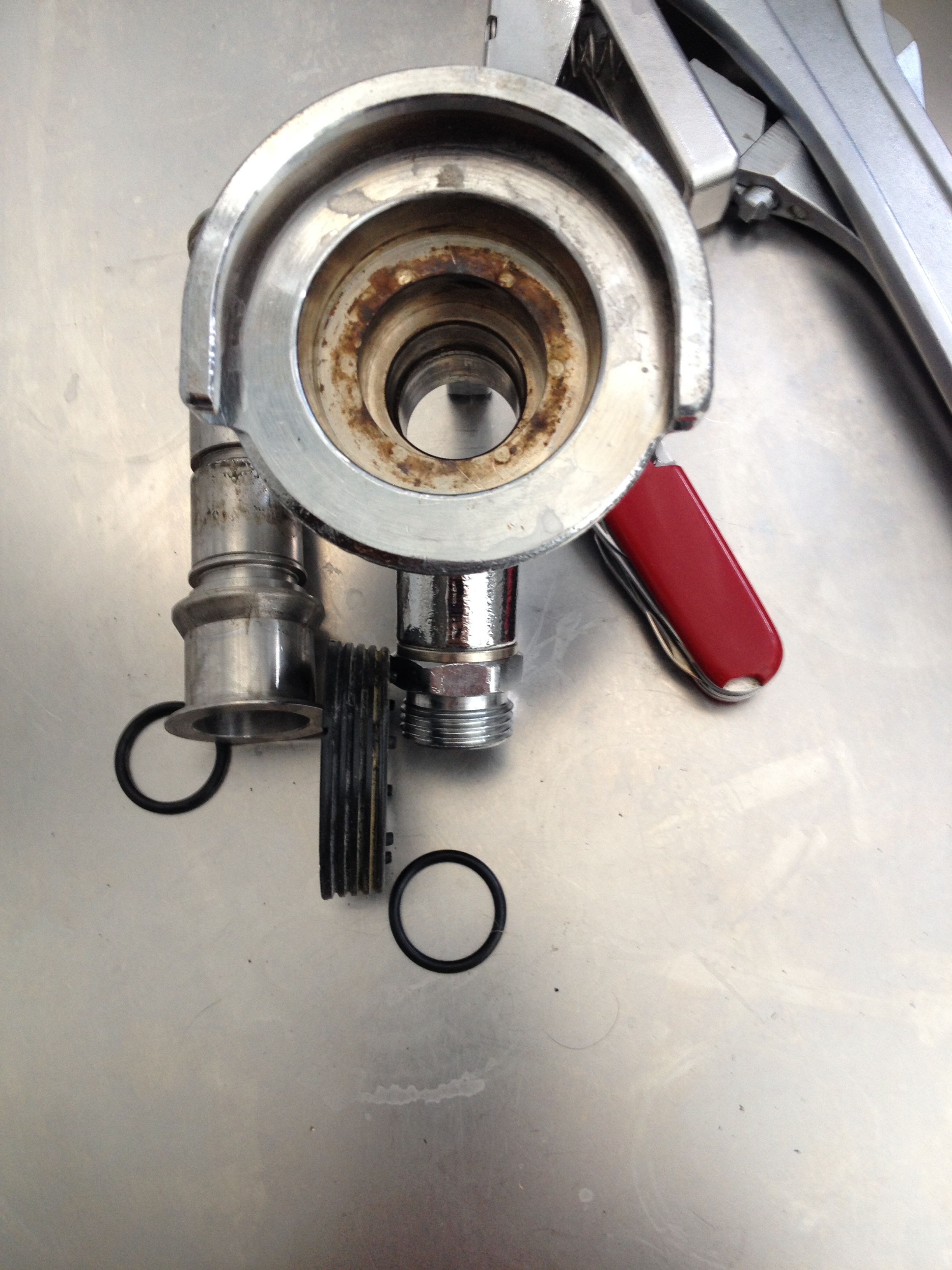 Это — Micromatic. На обоих фотографиях очень хорошо заметны остатки пива на внешней поверхности трубки из нержавеющей стали и на стенках внутренней полости головки, где помещается данная трубка (эти поверхности и образуют газовый канал). К чему такое положение дел может привести? Правильно, это потенциальный рассадник контаминантов. Напрашивается возражение — пиво ведь там не течет. Правильно, но там течет газ. Когда вы поставите такую головку на КЕГ со свежим пивом и откроете кран подачи СО2 поток газа будет подхватывать всякую живность растущую в рассаднике и направлять ее вниз — в ваше пиво.