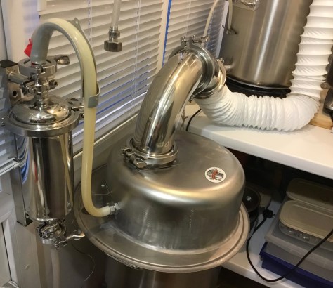 На этом фото также можно увидеть ещё одно интересное приспособление — фильтр (слева) предназначенный для очистки сусла от взвесей горячего помутнения с помощью технологии намывного слоя. Без насоса эта технология также не работает.