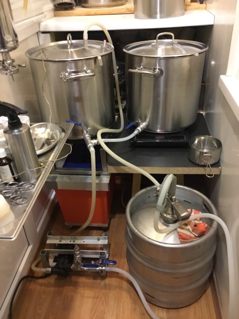 Когда конический ферментор сменила Первая домашняя пивоварня (75 см от пола) с автономной системой охлаждения и отпала необходимость в холодильнике насос по-прежнему служит верой и правдой — все также качает горячее сусло.