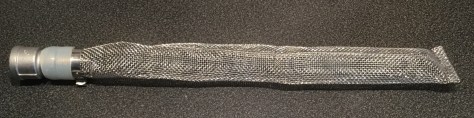 Для определения возможности задерживать частички хмелевой дробины обе сетки помещались в корпус фильтра. Вот так выглядит сетка «базука» установленная в сливной штуцер крышки фильтра.