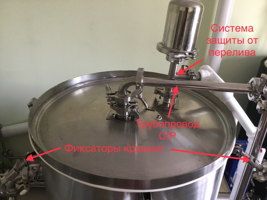 На фото показано несколько трубопроводов. Все они необходимы. Верхний это подача промывочной воды (для удаления из дробины ценного сахарного сиропа), чуть ниже — трубопровод загрузки затора в фильтр-чан, самый нижний — сток чистого сусла. Сверху на крышке бака установлена моющая головка ротационного типа для безразборной (CIP) мойки и система защиты от перелива (пивоварня автоматическая — мало ли что может перегореть, а канализационного стока в полу помещения нет, посему крышка надежно фиксируется, а трубопровод из полипропилена ведет в специальный дренажный бак).