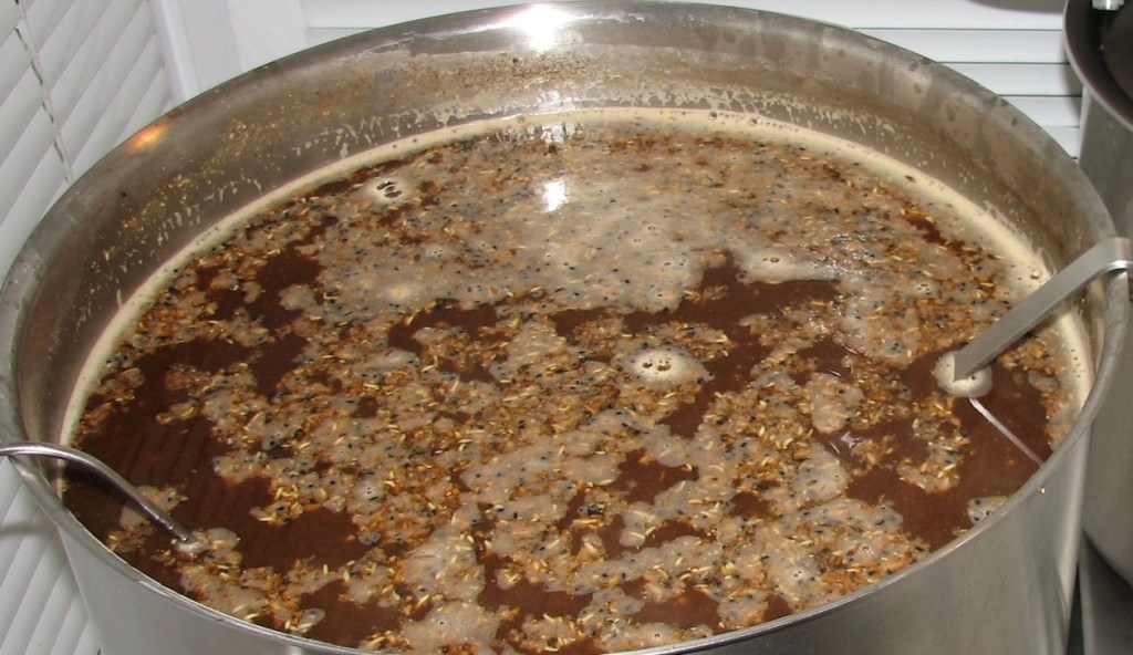 По окончанию процесса затирания котел будет содержать некоторую смесь состоящую из так называемого первого сусланасыщенного сахарами, в котором частично плавают, но по большей части лежат на дне, мякинные оболочки и другие останки измельченного зерна лишенные крахмала и многих других веществ. Именуются эти останки (все вместе взятые) дробиной. Выглядит содержимое заторного котла примерно так, как показано на фото ниже (к сожалению нет фотографию затора в большом котле и эта была кое-как найдена среди старых фото).