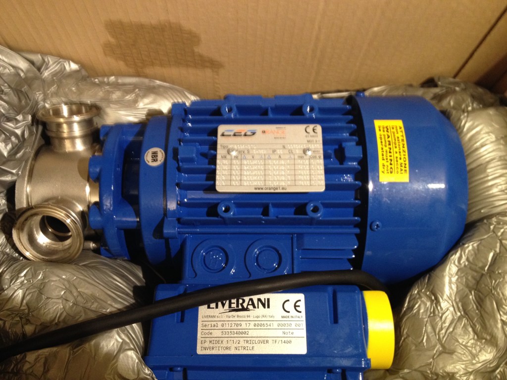 Кроме бака горячей воды и показанного выше насоса для перекачки затора и сусла система включает импеллерный насос для подачи горячей и ледяной воды, трубопроводы, клапаны и разную мелочевку. На фото ниже показан импеллерный насос с санитарными подключениями типа Tri clamp в заводской упаковке.