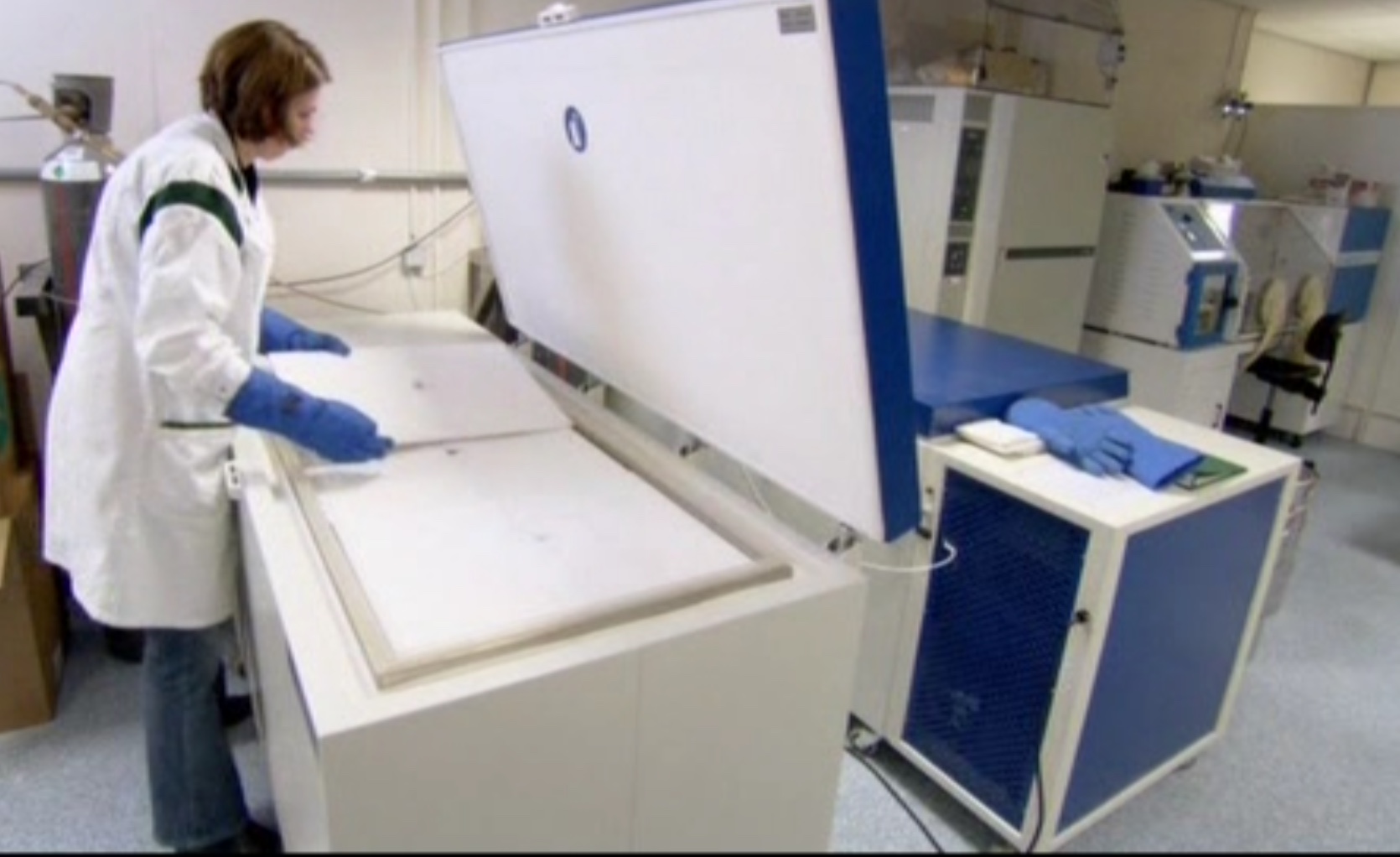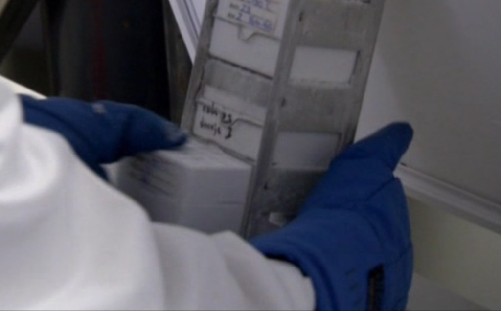 Вы только не подумайте, что это обычный бытовой морозильник. Заглянем в книгу Криса Уайта: «You may have heard that professional yeast banks store their stocks frozen at -80° C, and they can store properly frozen yeast indefinitely… -80° C storage is the best way to prevent mutation». «Возможно, вы слышали, что профессиональные дрожжевые банки хранят свои запасы замороженными при -80 ° C, и они могут хранить правильно замороженные дрожжи неограниченное время… хранение при -80 ° C — лучший способ предотвратить мутации». Вот так выглядит содержимое фризера. (Перчатки нужны для того чтобы руки не примерзли к контейнерам охлажденным до -80С).